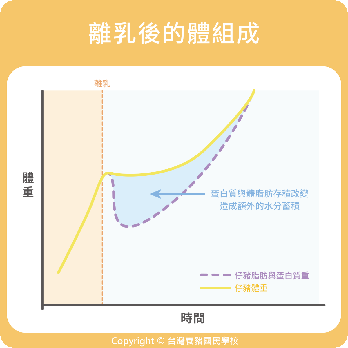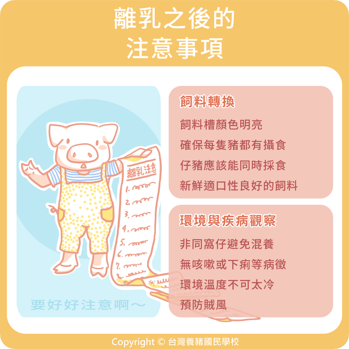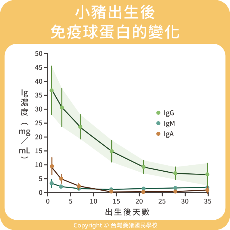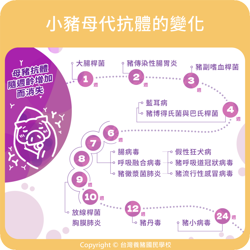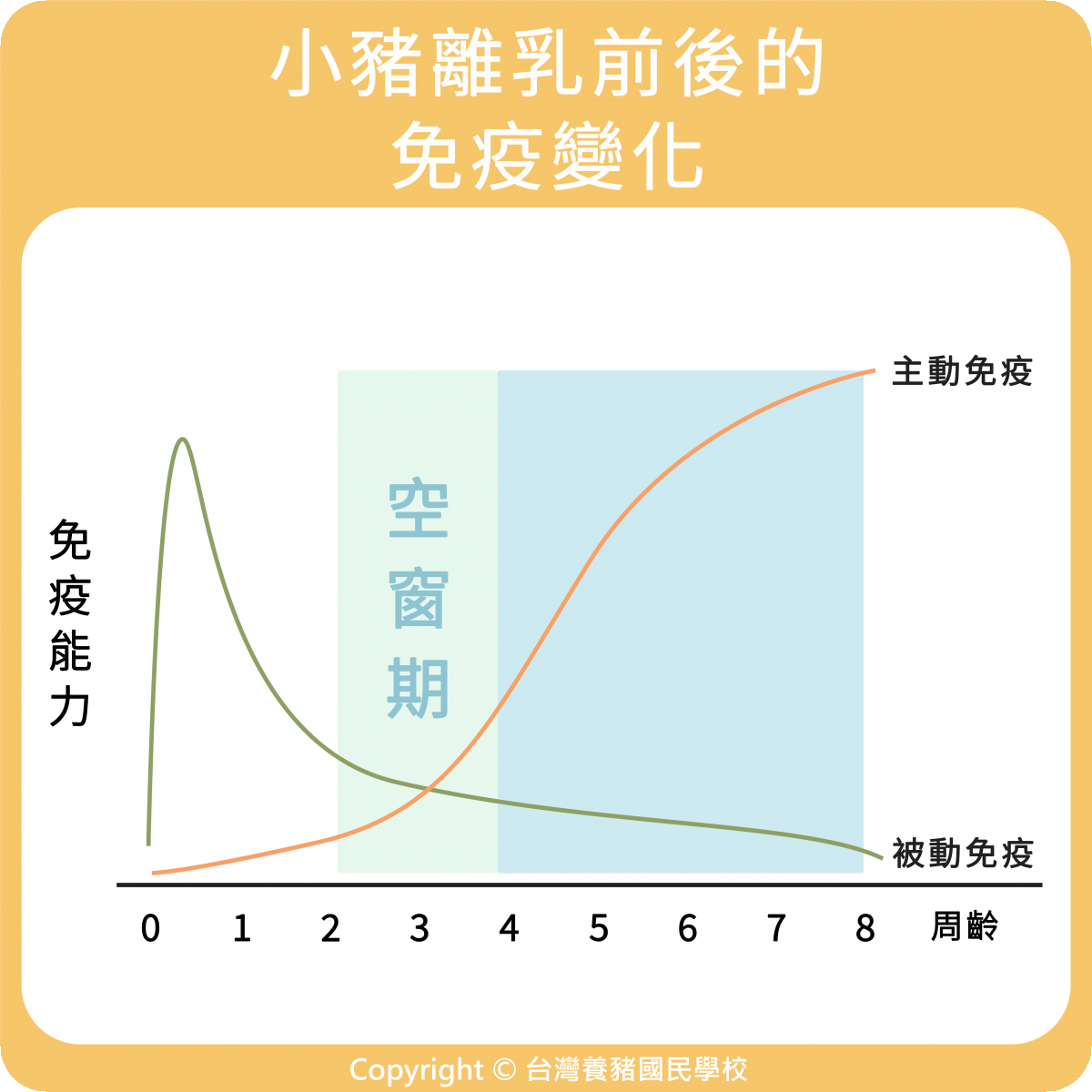 隨著時間過去,母豬乳汁中的抗體漸漸降低,而仔豬的免疫系統也慢慢地建立起來了。在這之間,大約於甫離乳時,仔豬的抵抗力會來到最低點,此時容易受到微生物感染,因此需要特別注意離乳仔豬的健康狀況。