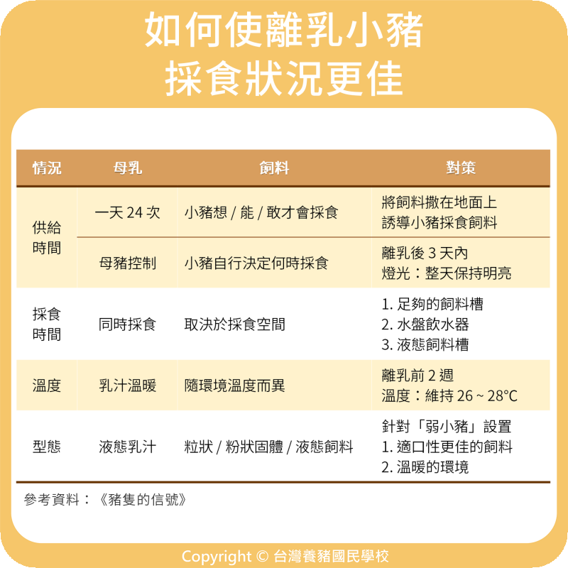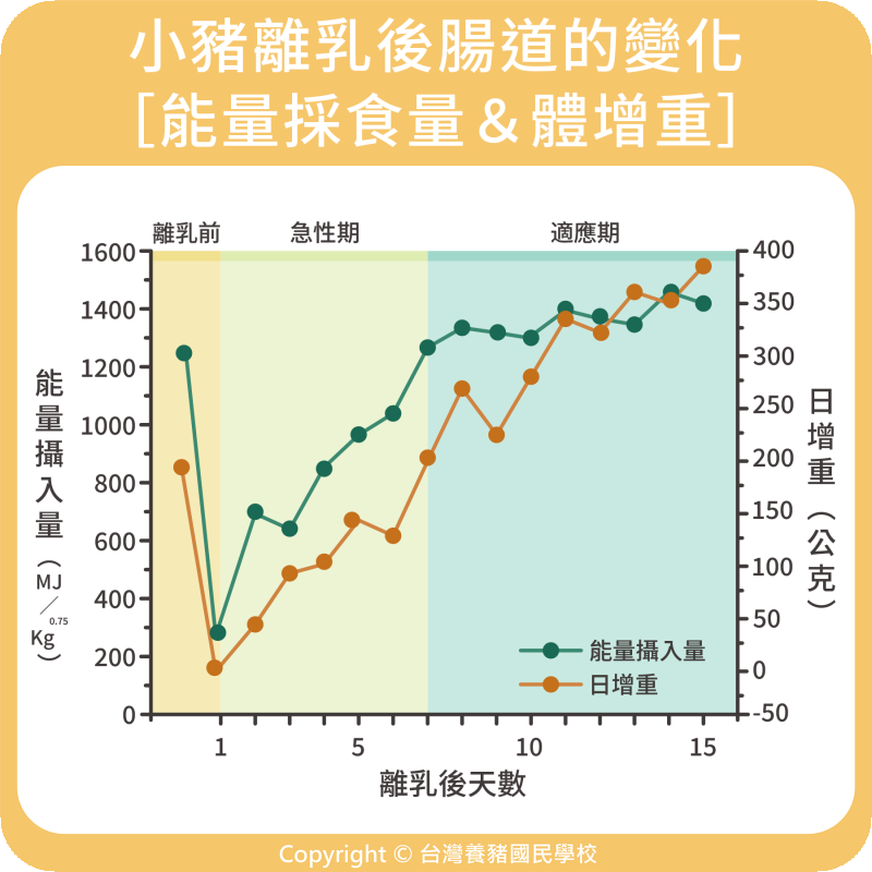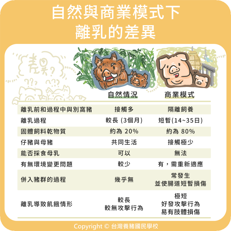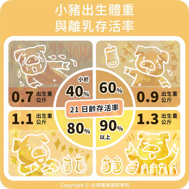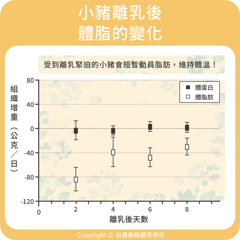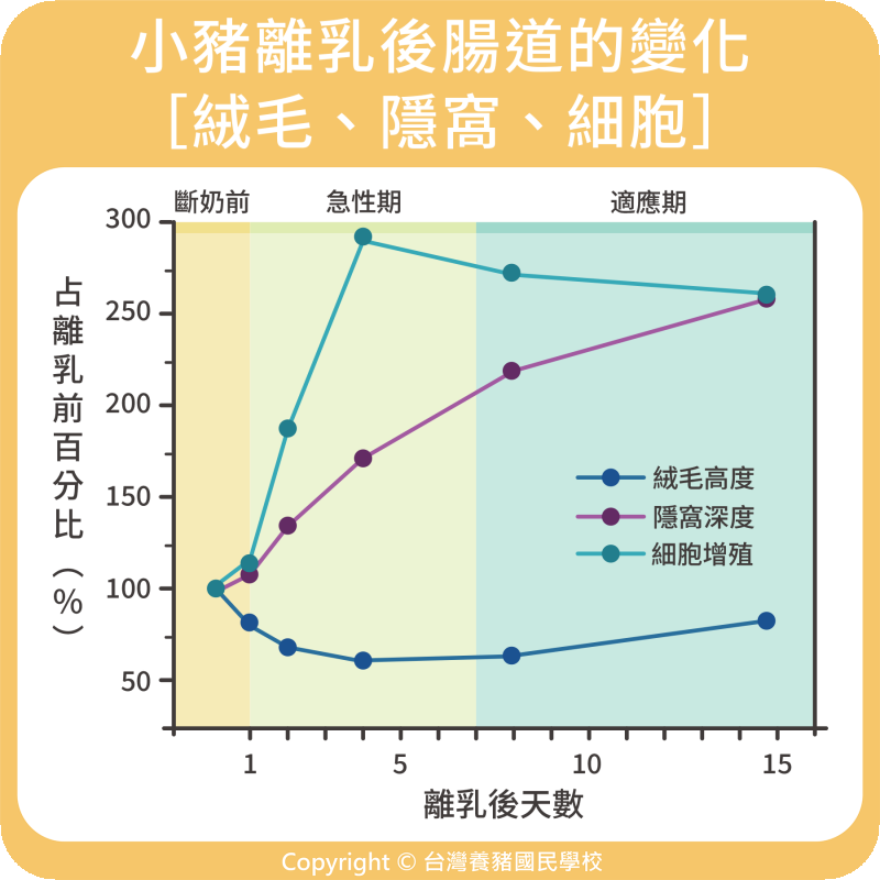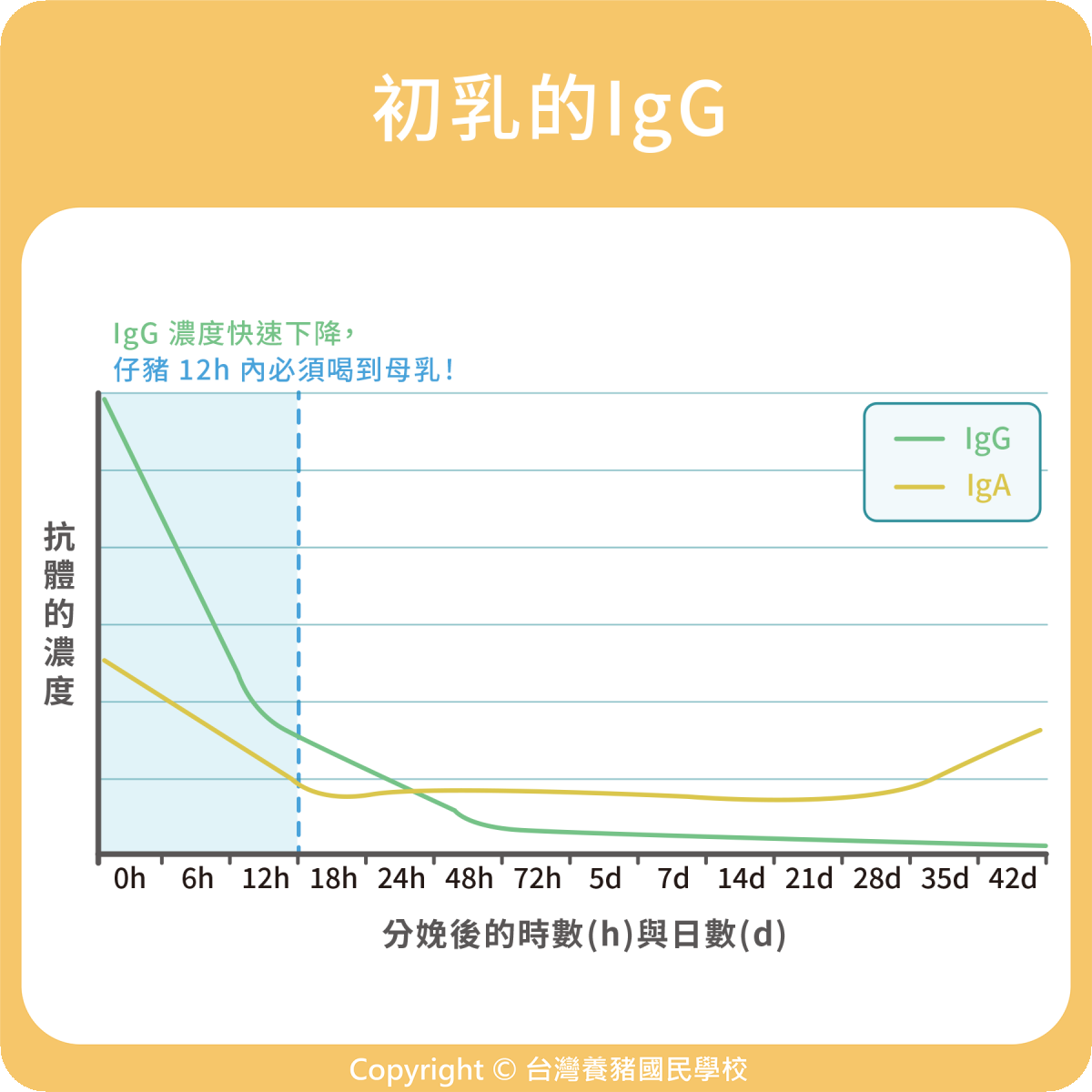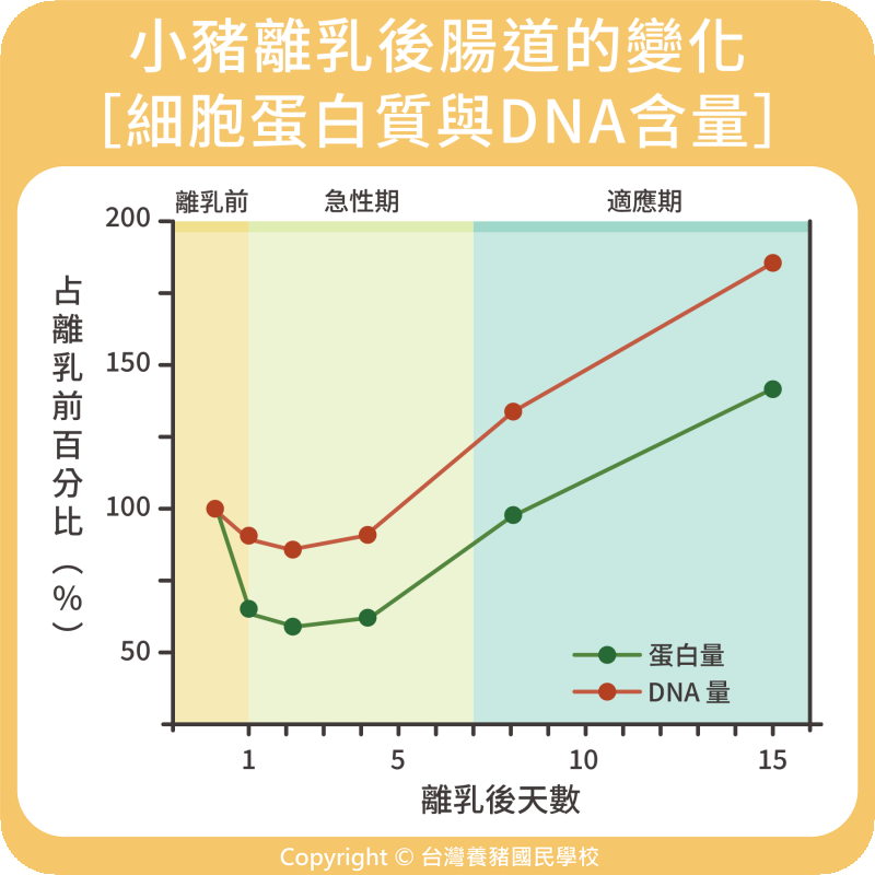 隨著時間過去,母豬乳汁中的抗體漸漸降低,而仔豬的免疫系統也慢慢地建立起來了。在這之間,大約於甫離乳時,仔豬的抵抗力會來到最低點,此時容易受到微生物感染,因此需要特別注意離乳仔豬的健康狀況。